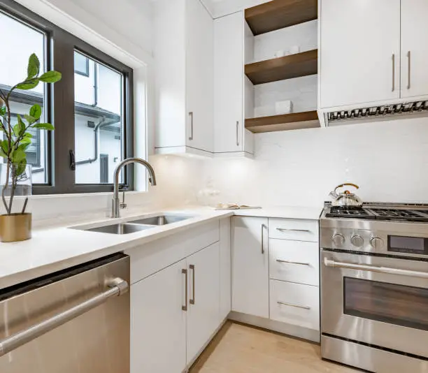 The L-shaped kitchen is one of the most popular layouts in Canada. It utilizes two adjacent walls, creating an efficient work triangle between the sink, stove, and refrigerator. This layout is perfect for small to medium-sized kitchens because it maximizes corner space while leaving room for movement.